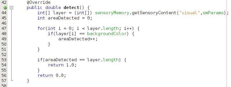 - Sobrescreve o método "detect()" com seguinte algorítmo: recebe do "sensoryMap" tudo o que foi visto num bitmap e compara, ponto a ponto, cor do fundo - BRANCA - contabilizando quantos pontos viu de cor diferente. Faz a proporção de pontos não brancos que encontrou dentro de toda a área vista. Ativação máxima é indicada se essa proporção for equivalente à proporção esperada, configurada pelo parâmetro "area".
