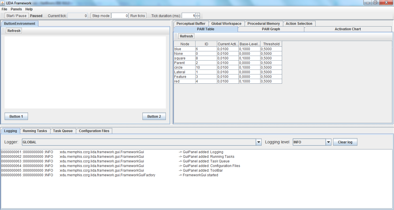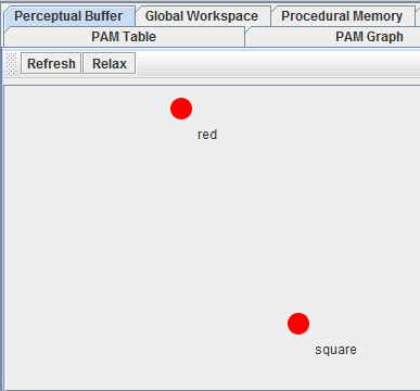 2 – Objetivo: Familiarização com a funcionalidade de detecção, interação de código, estudo da GUIPanel ( PAM table, Perceptual Buffer e GlobalWorkspace) , personalização da GUI e o espaço de trabalho do modelo situacional corrente.