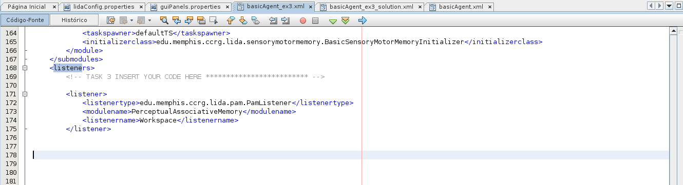 Nesta tarefa, é criado um novo listener dentro do arquivo Agent.xml. Seguindo o tutorial, este novo listener terá os seguintes valores de tag: listenertype = edu.memphis.ccrg.lida.pam.PamListener, modulename = PerceptualAssociativeMemory, listenername = Workspace.